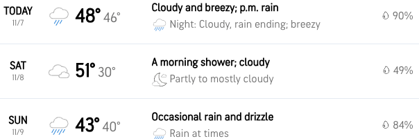 Burlington's got a bit of everything coming our way this weekend, weather wise. Today started dry but clouds rolled in after sunrise and they're settling in for the long haul. Rain's moving in late this afternoon, potentially mixed with some mountain snow up high. We're looking at upper 40s to low 50s today, though those gusty winds will make it feel cooler, with some spots in the Champlain Valley potentially seeing 45 mph gusts this evening. The bulk of tonight's rain clears out by Saturday morning, leaving us with what looks to be the weekend's golden child: Saturday afternoon brings partial clearing, actual sunshine, and temperatures climbing into the low 50s. Sunday's a different story, starting with possible morning snow showers even in the higher elevations, transitioning to rain by afternoon. Monday and Tuesday keep the unsettled pattern going with temperatures stuck in the 30s, and Veterans Day could bring Burlington its first proper snow of the season.